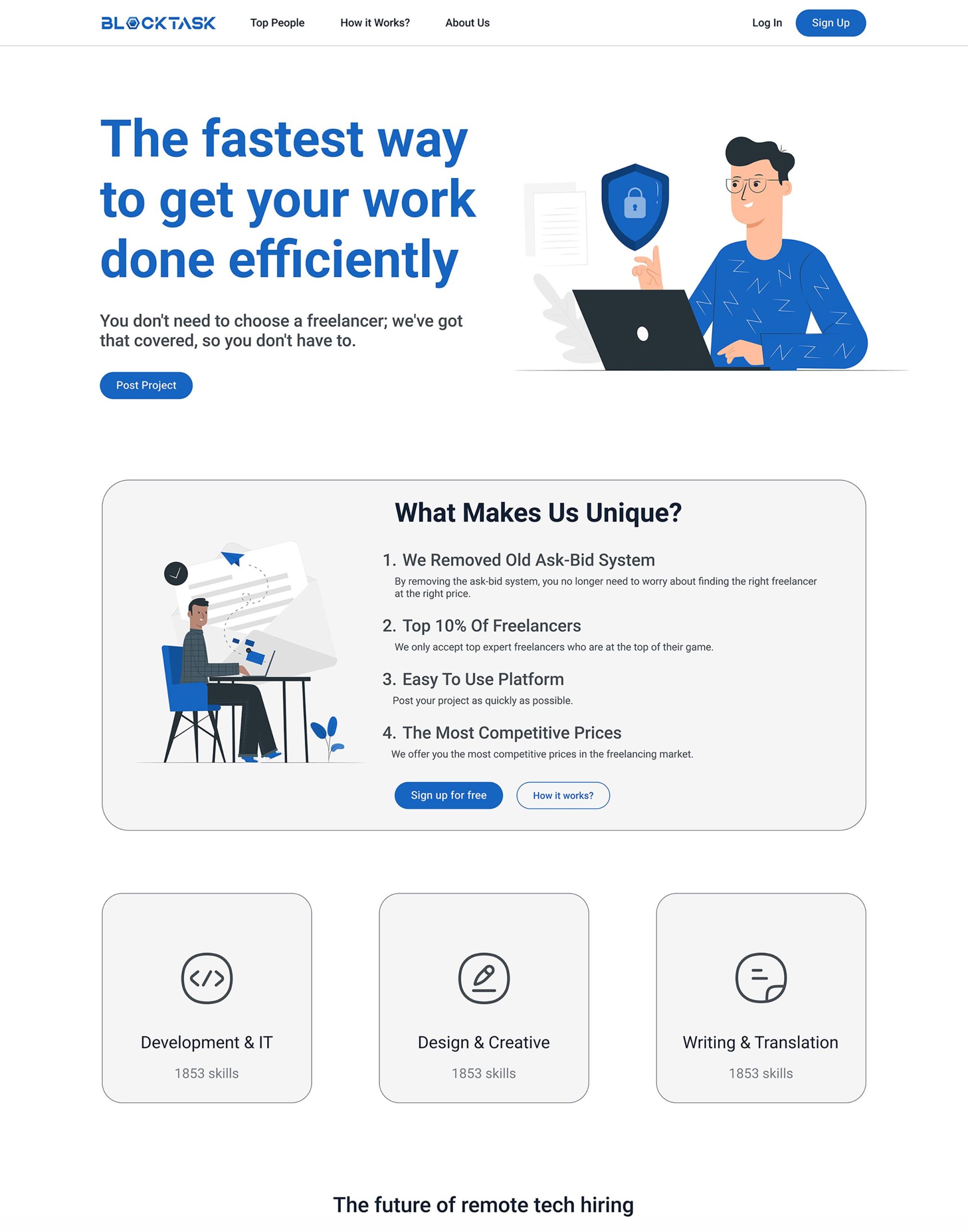 - Uses blockchain-based **smart contracts** to ensure secure payments and transparent project management.